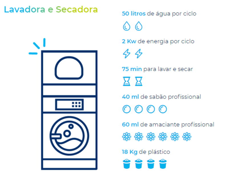 A lavanderia compartilhada funciona 24 horas por dia, dando total liberdade para o morador realizar a lavagem de suas roupas no horário que encaixe em sua rotina, além de ter suas roupas limpas e secas em pouco mais de uma hora.